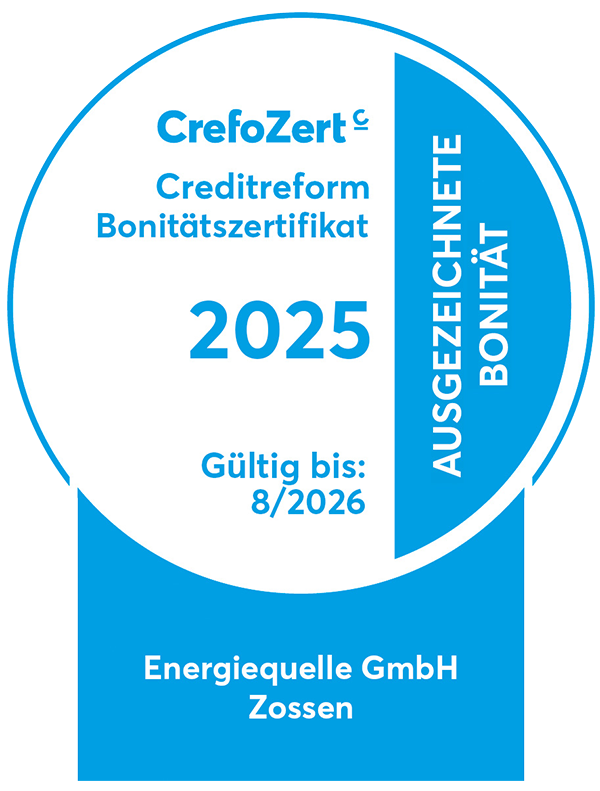 The certificate is issued by the credit reference agency Creditreform, a leading expert in Germany for assessing the creditworthiness of companies. The award is based on a three-stage certification process, which includes the credit rating index, an analysis of the annual financial statements and a personal interview. As part of this audit, Energiequelle regularly demonstrates an excellent credit structure and fulfils all certification criteria.